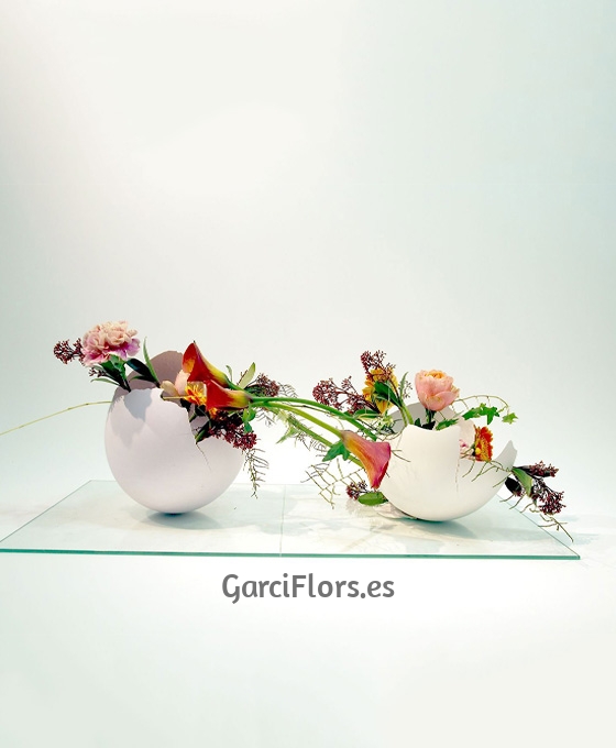 Composición vanguardista, consta de una bandeja de vidrio y dos bases hechas a mano conectadas con flores de temporada.