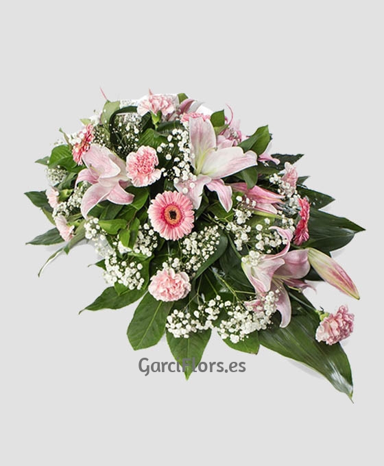 Especial y elegante este Centro Funerario Tonos Rosas. Es un centro de flores para tanatorio, de flores para difuntos variadas, en tonos naranjas, confeccionado con gerberas, claveles y paniculata y verdes variados que le dan al centro un toque dulce y delicado. Nuestros centros de flores para fallecido se envían a los Tanatorios como muestra de cariño, aprecio y acompañamiento para la familia de la persona fallecida.