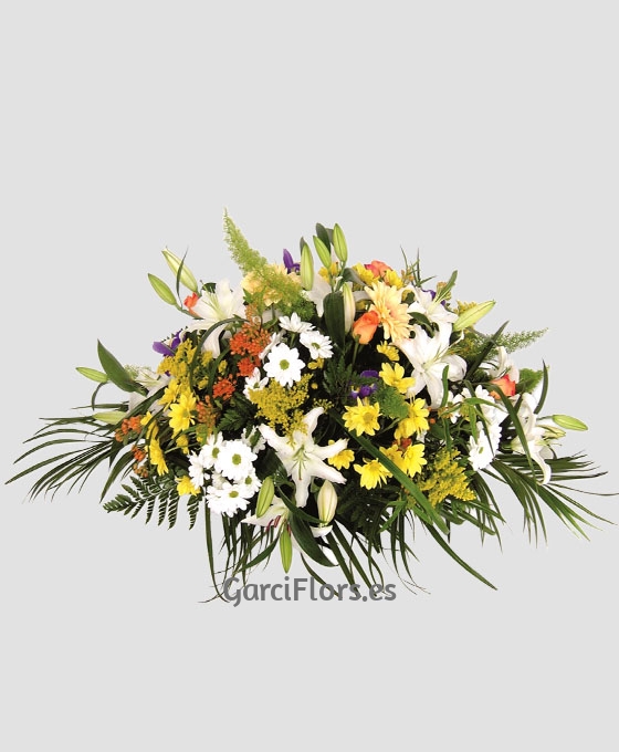 Bonito y silvestre, Palma Funeraria Primaveral. Es un centro funerario de flor variada, con rosas, margaritas, lilium, gerberas, solidago y verdes de gran calidad, que le dan al centro un toque de elegancia. Nuestros centros de flores para dar en el tanatorio se envían a los Tanatorios como muestra de cariño y acompañamiento para la familia de fallecido. Este centro funerario está realizado en tonos amarillos, naranjas y blancos y con producto de total calidad, que nos suministran nuestros proveedores, tanto nacionales como internacionales. Por lo que nuestros floristas lo elaboran lo más parecido posible o a gusto del cliente. Si quiere enviar flores al tanatorio urgentes, nuestros trabajos de flores para entierros, están siempre realizados con flores para tanatorio y verdes de primera calidad y nos lo suministran tanto proveedores nacionales, como internacionales. Son centros funerarios efectuados de forma artesanal por nuestros profesionales floristas, por lo que su centro quedará bonito y elegante.