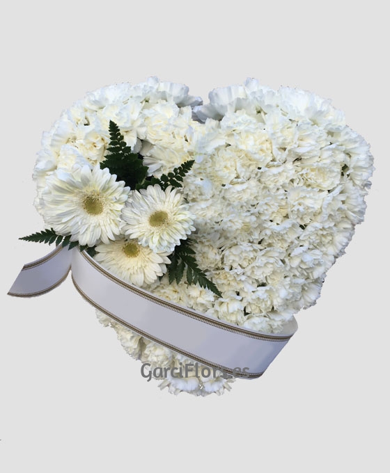 Fino y elegantes es este Corazón Funerario Claveles y Gerberas, realizado con flores para tanatorio clásicas, Este bonito corazón, está decorado con claveles y gerberas y bonitos verdes variados fúnebres y bonitos verdes variados. Es un corazón de flores fúnebres blancas, especialmente elegante y bonito. Nos indica el amor que se siente hacia la persona querida fallecida. Además, gracias al servicio de envío de flores a tanatorio, podrás recibir este corazón en el momento indicado y acompañar el sentimiento de la familia del difunto.