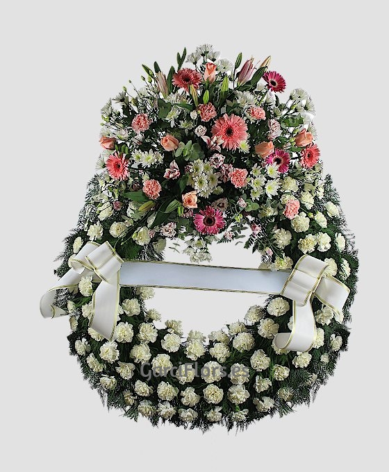Preciosa Corona Funeraria Especial de nuestra floristería online. Esta Corona funeraria, tiene un hermoso cabezal, situado en la parte superior de flor variada. Este cabezal está compuesto de lilium, rosas, claveles, margaritas, lisianthus. El aro es de clavel blanco. Todo ello salpicado de bonitos verdes. (Aro de 70-80 cm., con un cabezal, de 90 a 100 claveles, 8 varas de margaritas, 6 gerberas, 6 rosas de tallo corto, 4 lisianthums, 4 lilium LA, 6 claveles, verdes variados y cinta funeraria)