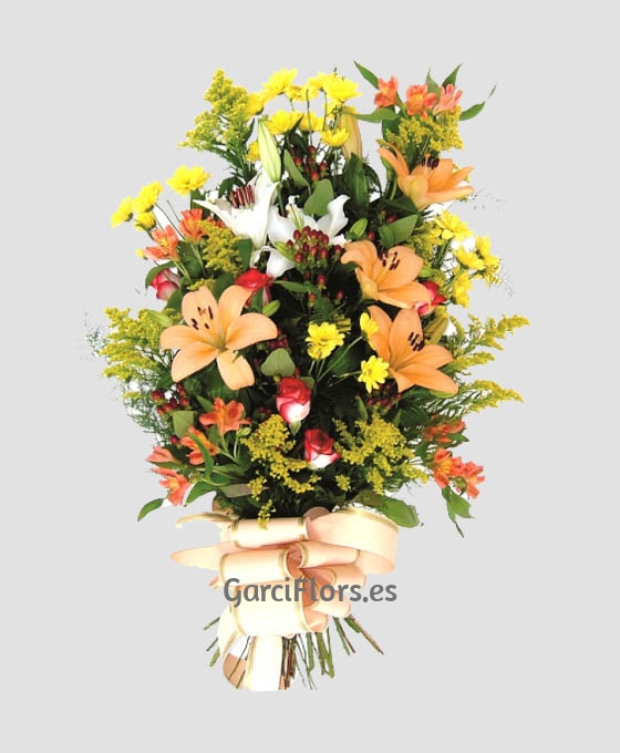 Bonito, de aire silvestre, este Ramo Funerario tonos Naranjas. Es un ramo de defunción, de flores variadas, en tonos naranjas, confeccionado con lilium, rosas, margaritas, solidago, hipericum. alstroemelia y verdes variados que le dan al ramo funerario un aire primaveral y silvestre. Enviamos los ramos como muestra de cariño, aprecio y acompañamiento para la familia de la persona fallecida. Este ramo de flores para difunto, es un producto extraordinario, con flores frescas suministradas a diario por nuestros proveedores, nacionales e internacionales. Por lo que lo elaboraremos lo más parecido posible o a gusto del cliente. Nuestros trabajos de flores para defunción, están siempre realizados con flores y verdes variados, Son ramos para funeral efectuados de forma totalmente artesanal por floristas profesionales, expertos en el arte floral funerario, por lo que su ramo quedará bonito y elegante.